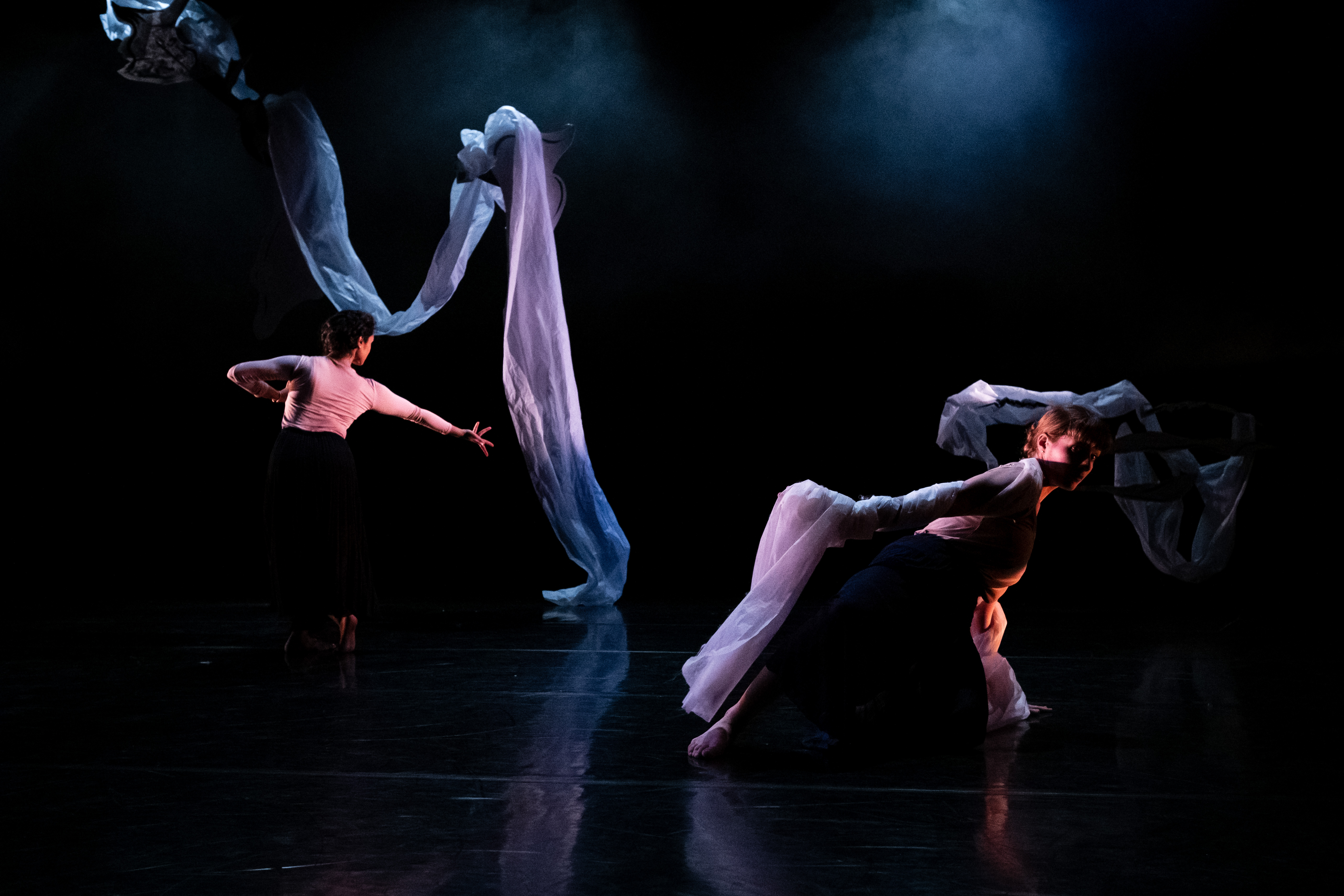Drawing from a richly varied choreographic language infused with floorwork and Bharatanatyam, the dancers’ movement is as striking as its sonic accompaniment. Their individual interaction with the cloth is fluid and spontaneous. Wide, yawning bends and stretches that travel from the floor to the air are informed by the ripples and undulations of the fabric as it is tossed and turned. This fluidity is disrupted by more forceful movements where extended limbs yank and pull at the cloth to create palpable tension.