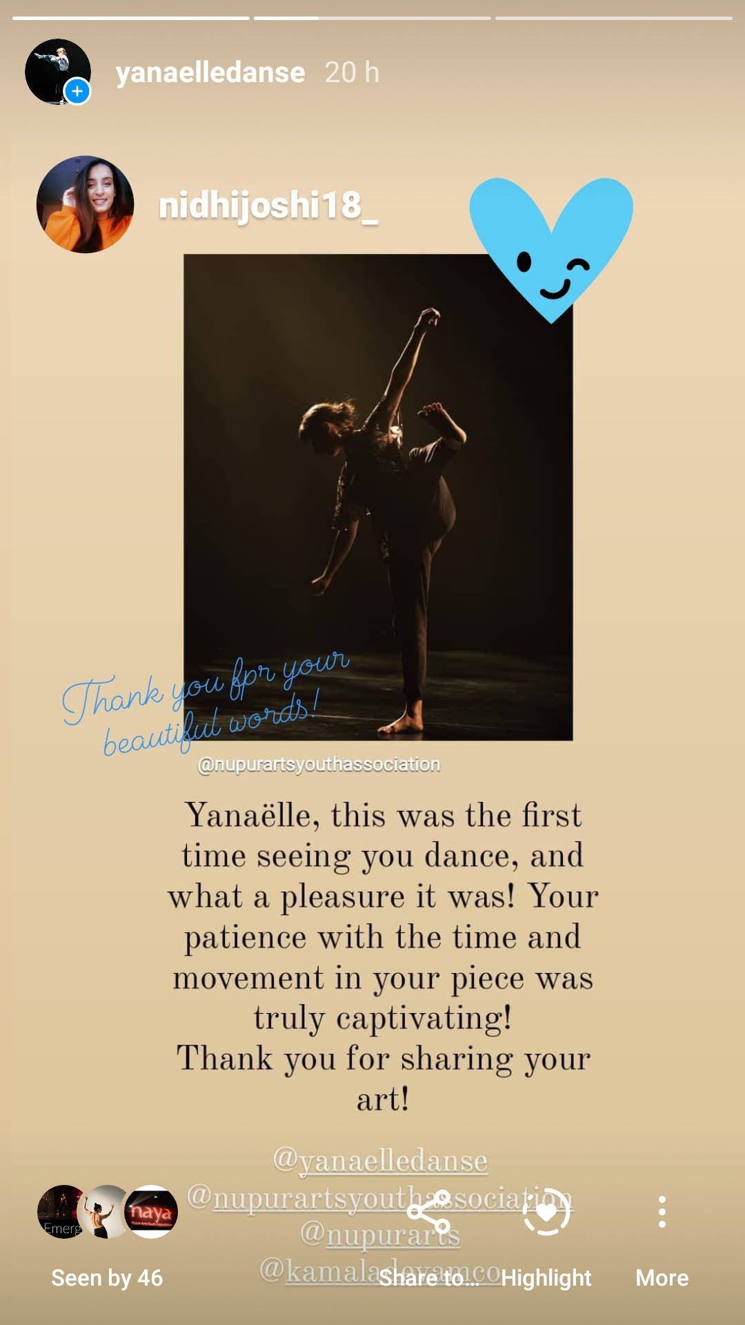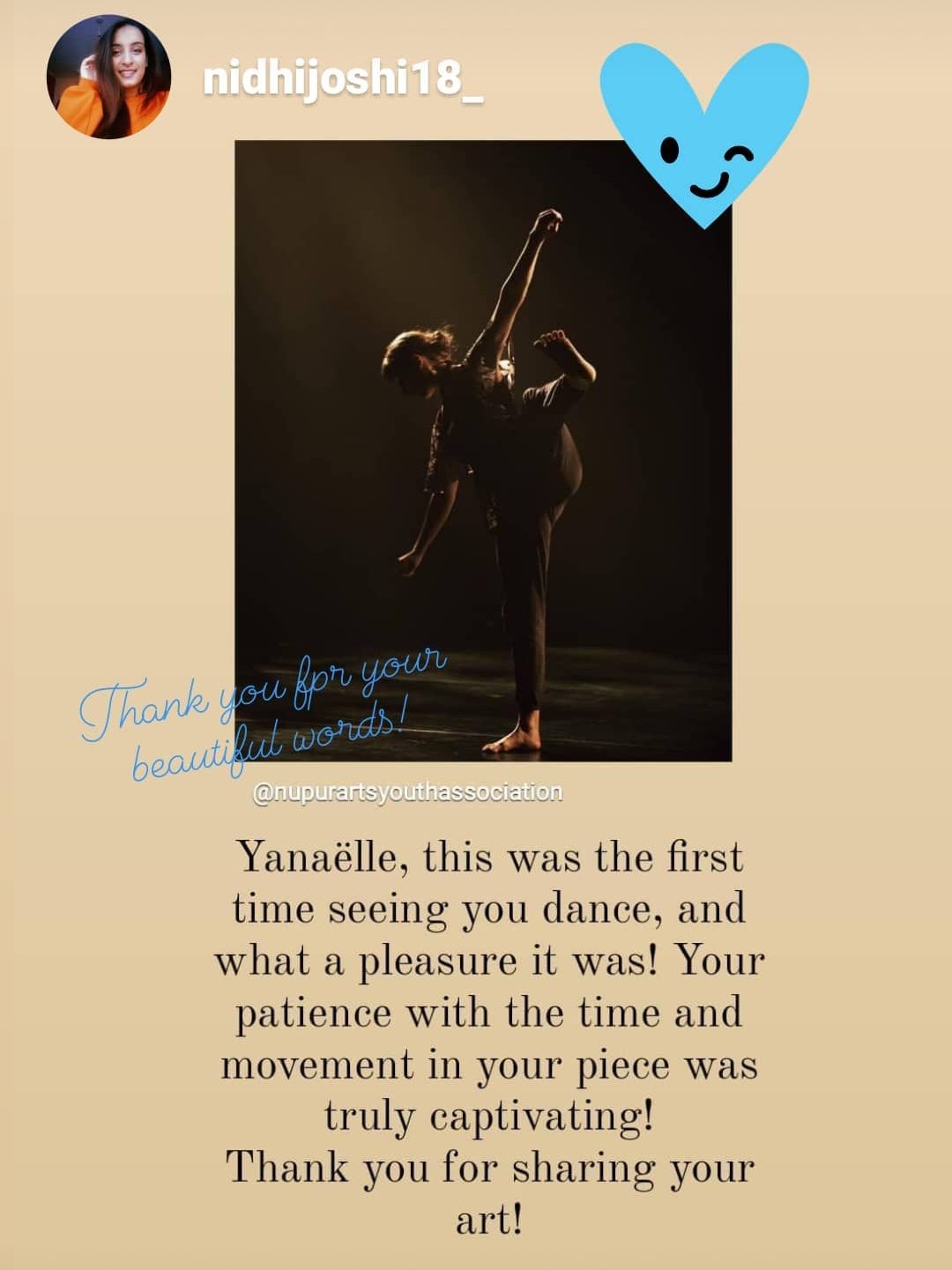 Choreography, dance performance, costume, sound editing: Yanaëlle Thiran. Choreography mentor: Kamala Devam. Lighting design: Jai Morjaria. Photos: Matthew Cawrey and Simon Richardson. Soundscape: ‘Strong wind through rocks’ by Leandros Ntounis; pebbles sounds by Yanaëlle Thiran; ‘Sand storm’ mixed by Isabelle Avalon and glass sounds by Kamala Devam. Duration: 5 minutes. Presented by: Nupur Arts Youth Association as part of the Emerge showcase, curated by Smita Vadnerkar.